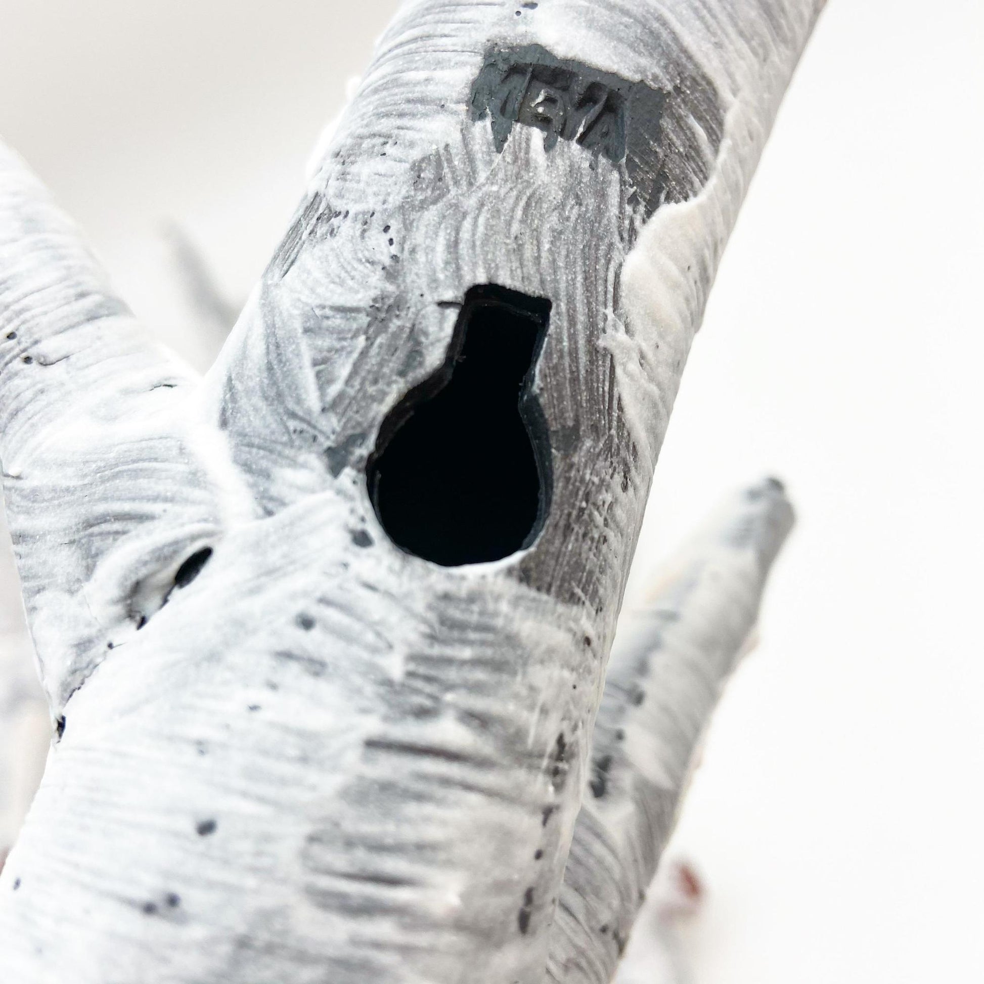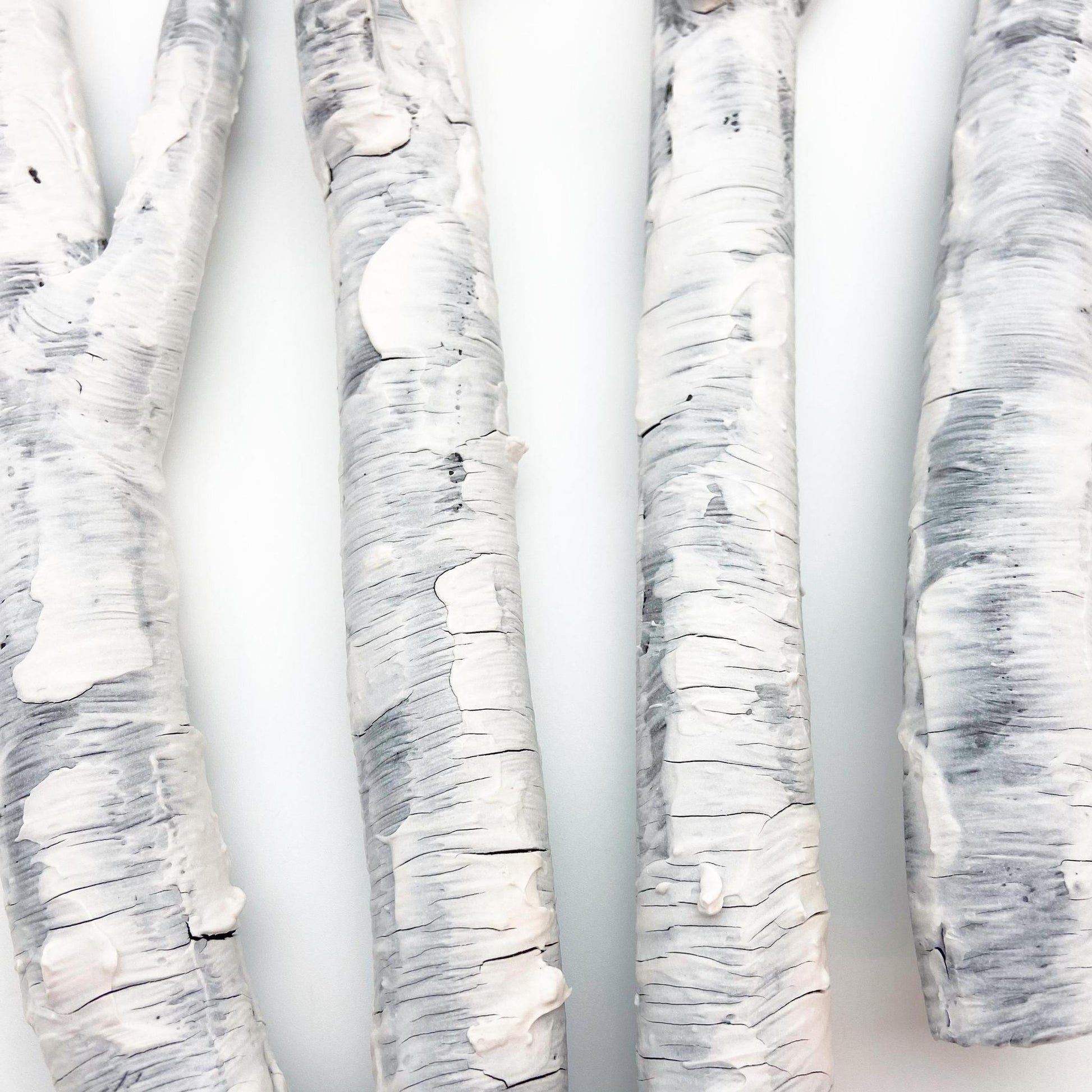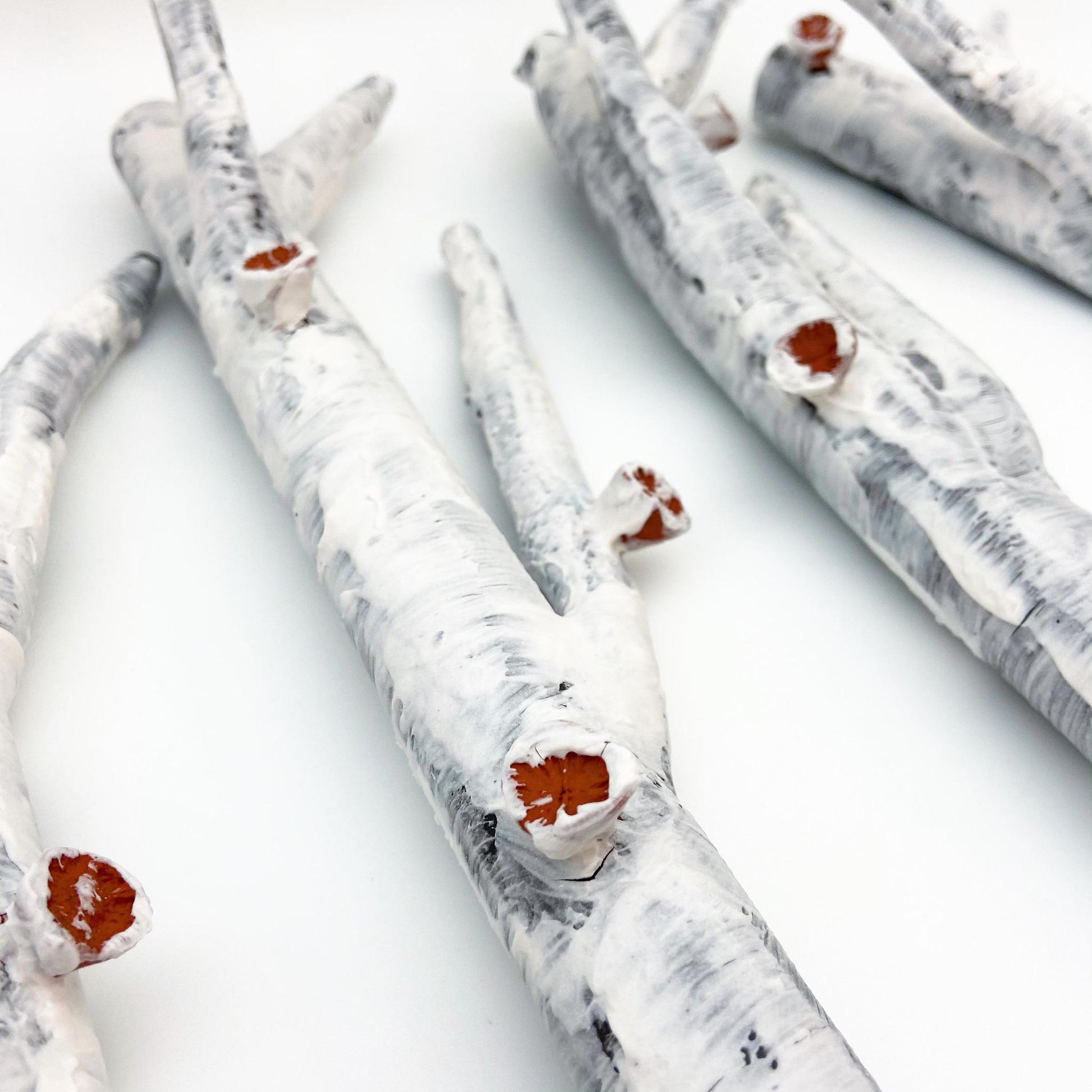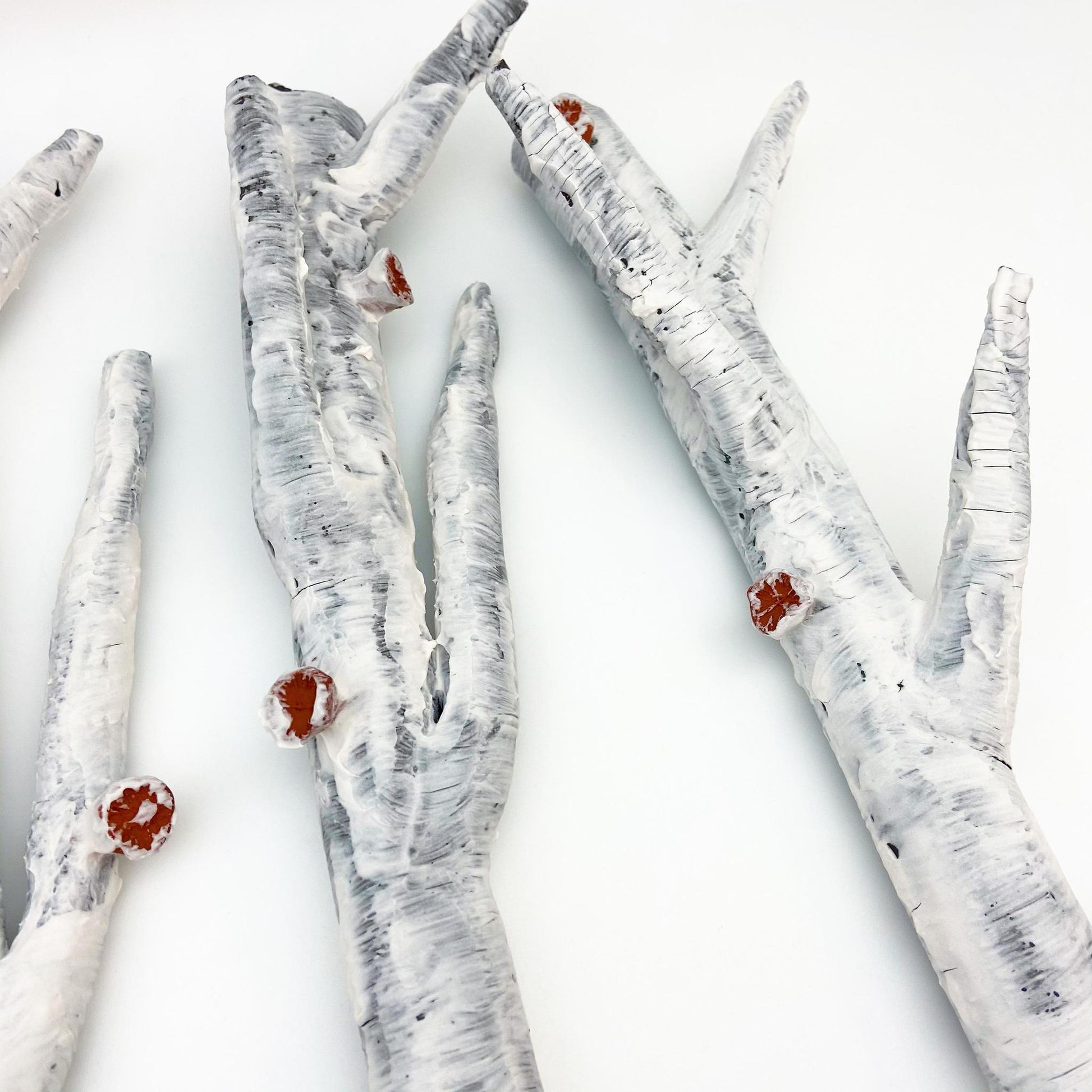 These stately aspen branches are hollow, handformed, and carved from ceramic. Kiln-glazed and fired cermamic.