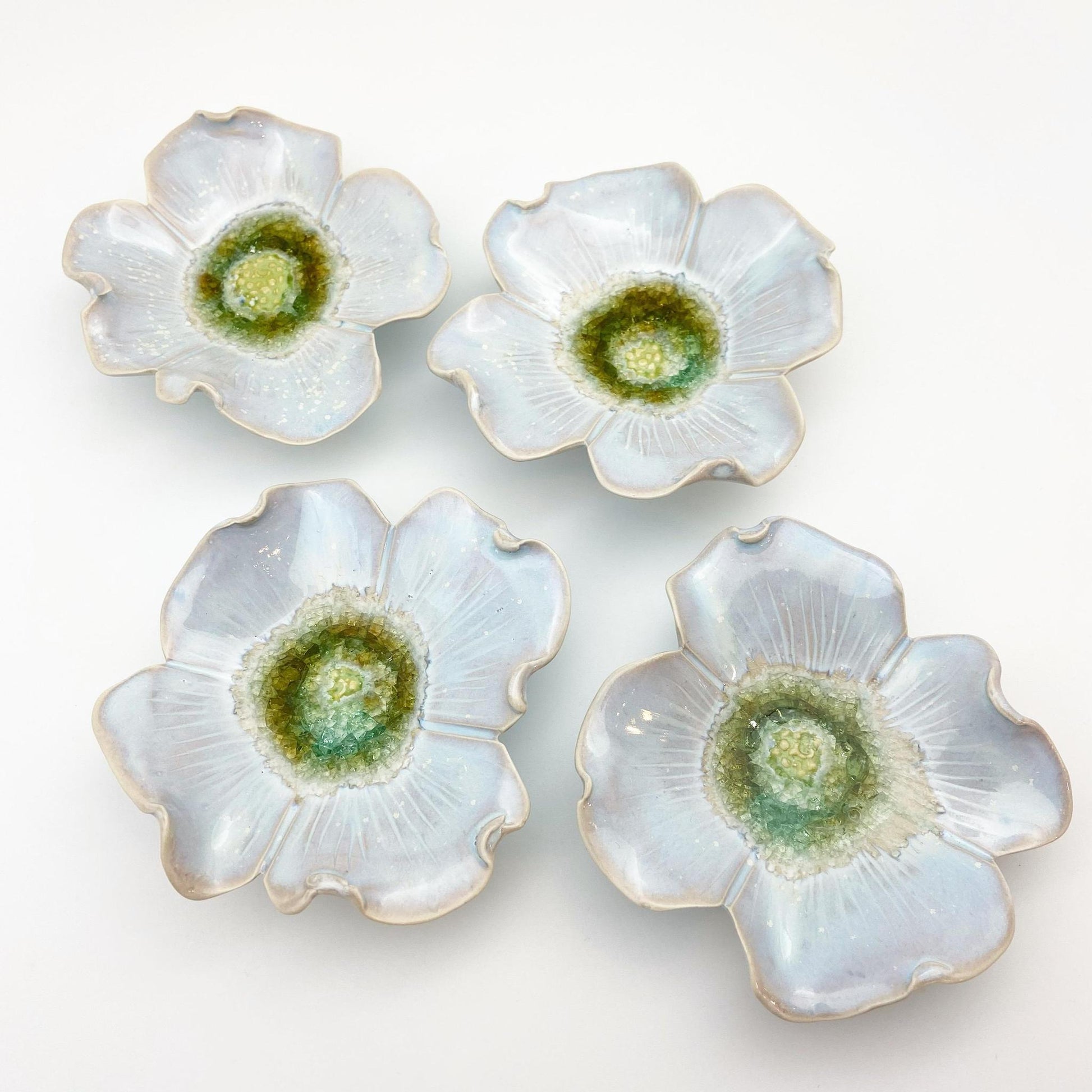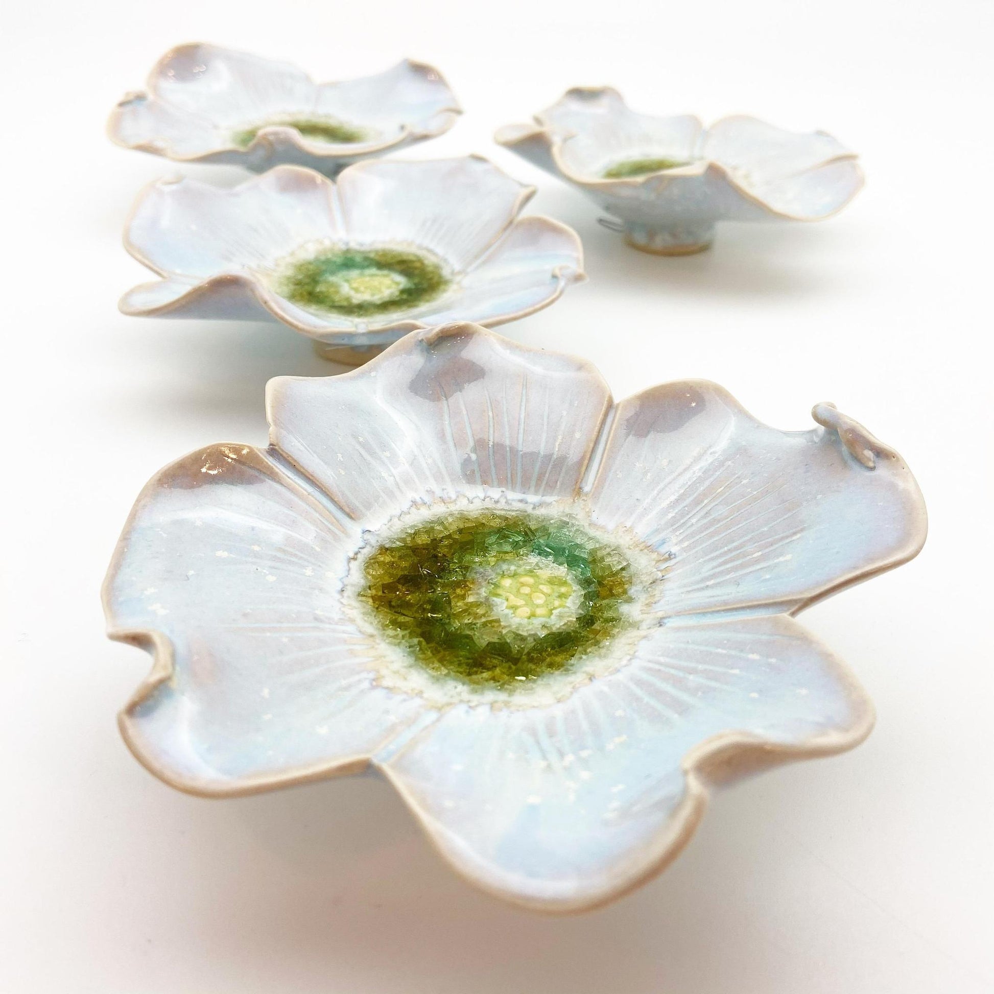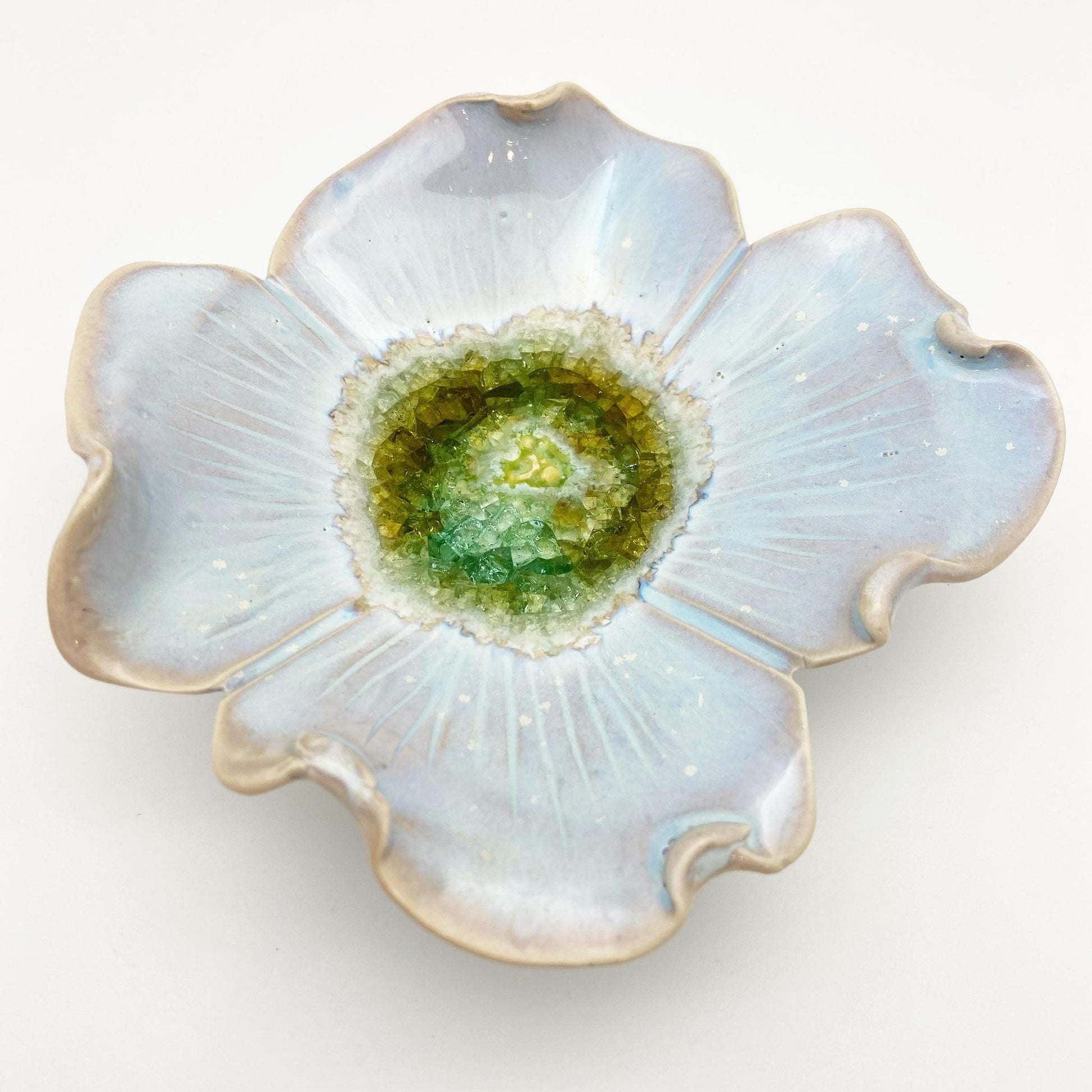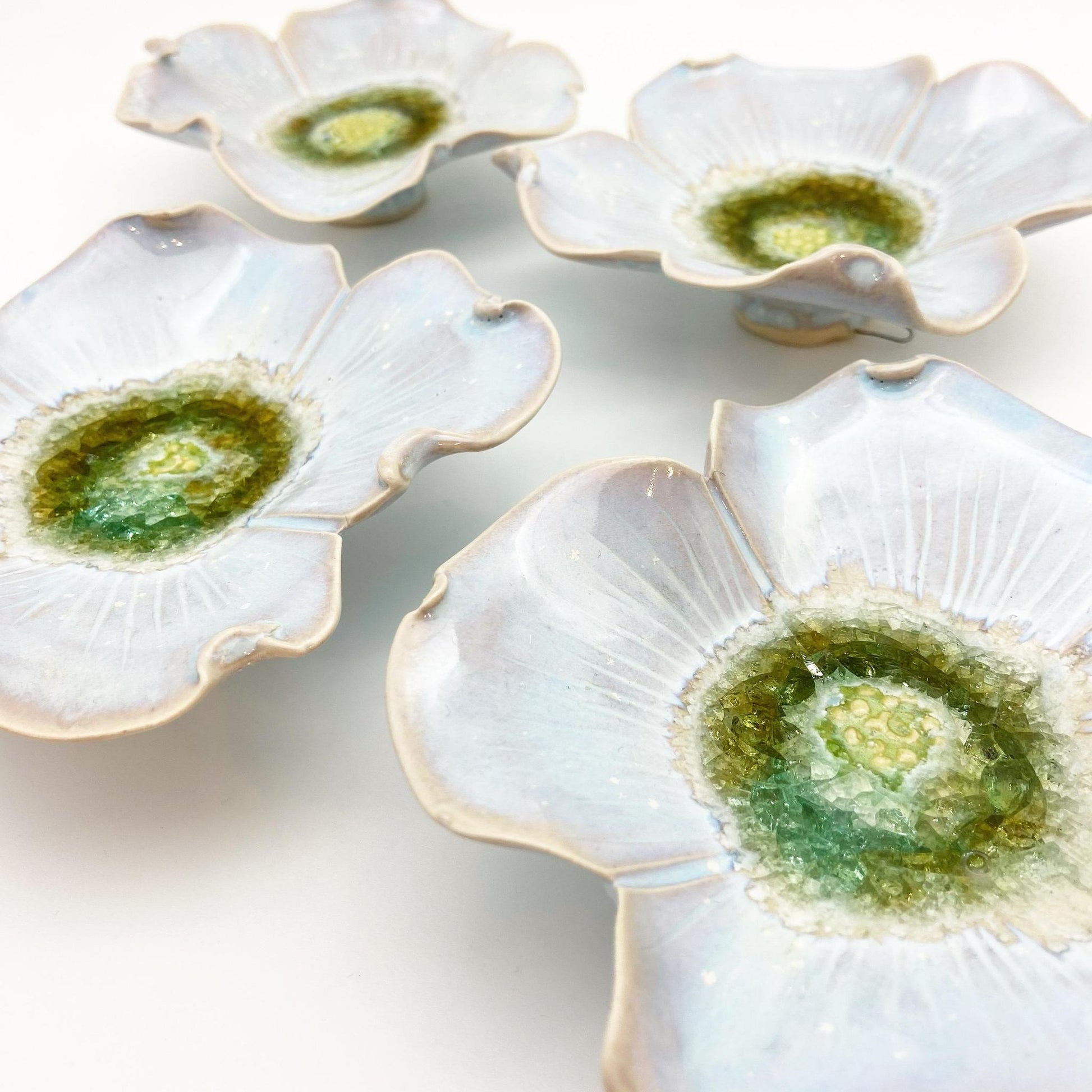 These pieces are individually handmade, kiln fired ceramic with fused glass. They are all one-of-a-kind. They are not molded/poured ceramics. They hang beautifully on the wall and can also sit on a table. The footed design allows the piece to sit or hang flat on most surfaces. Each piece is hand sculpted, carved, and glazed by the artist in her Kansas City studio. The center of the piece features glass frit (recycled glass powder) that creates the water-like center of the flower.
