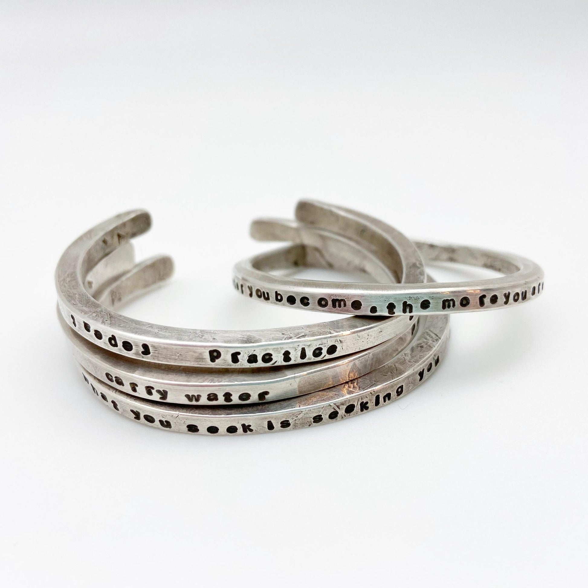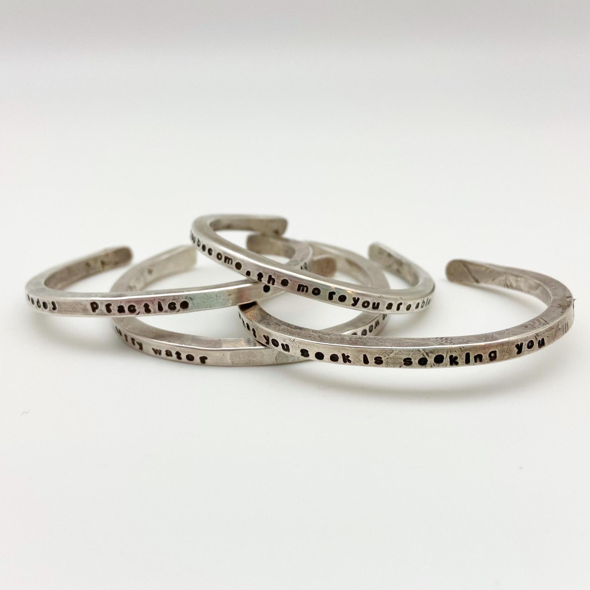 These solid sterling cuffs are talismans for daily life. Each features a quote or a collection of words to inspire, remind, encourage, and/or focus us. These pieces become beloved by the wearer. They can been worn alone or stacked with other bracelets. They have a substantial, solid feel and are made from pure sterling. Each piece has the artist's mark and is one-of-a-kind.